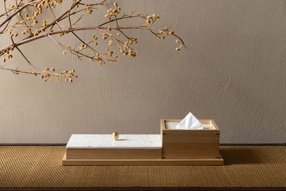 ティッシュボックスや小物入れなど、手に触れる機会の多いアメニティだからこそ、素材が伝える手触りや温度感が重要です。STELA AMENITYシリーズでは、ぬくもりのある木素材と組み合わせ、STELAPOPは蓋部分にさりげなく取り入れています。デニム素材をアップサイクルしたSTELAPOPならではの柔らかな表情が、上質な雰囲気を演出します。
