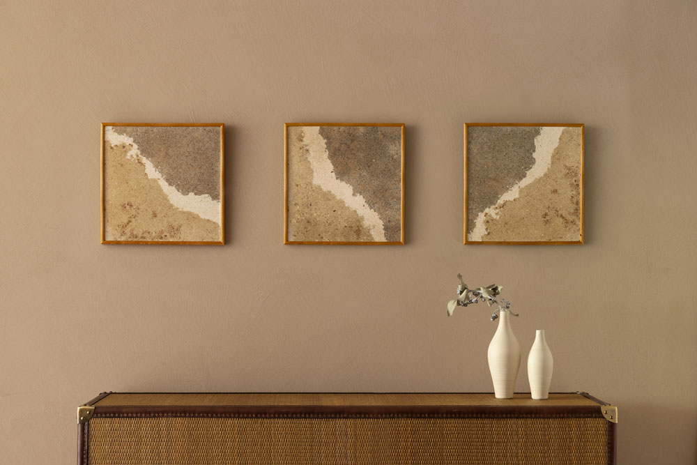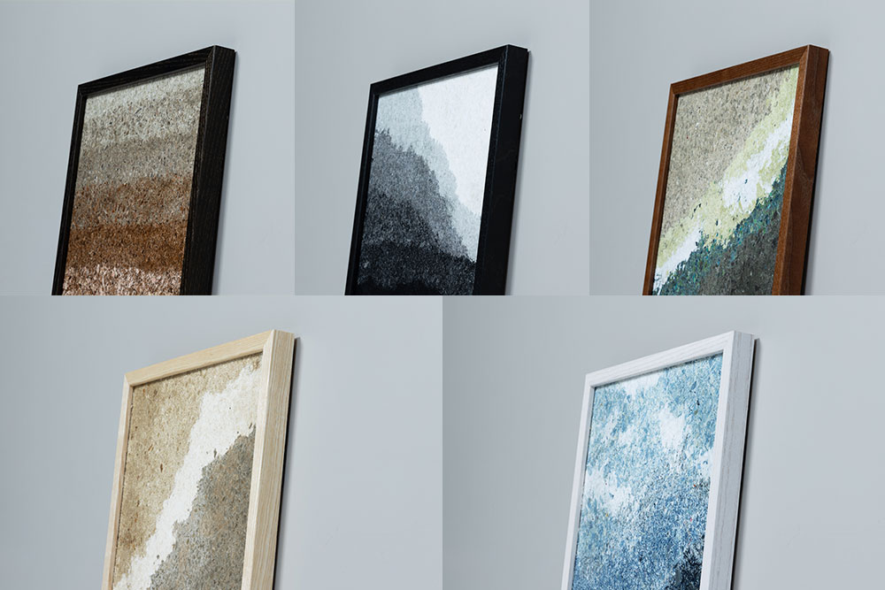デニム素材ならではの色ムラのあるSTELAPOPボードを、キャンバスとしてアートパネルに使用しました。同一シリーズでも一枚ごとに模様は異なり、まるで一点物の絵画のような味わいが感じられます。間接照明や斜光で繊維の凹凸が際立ち、時間帯や光の角度によって表情を変えることも魅力です。複数枚をリズミカルに並べることで、さらに多様な表情を見せるアートパネルです。